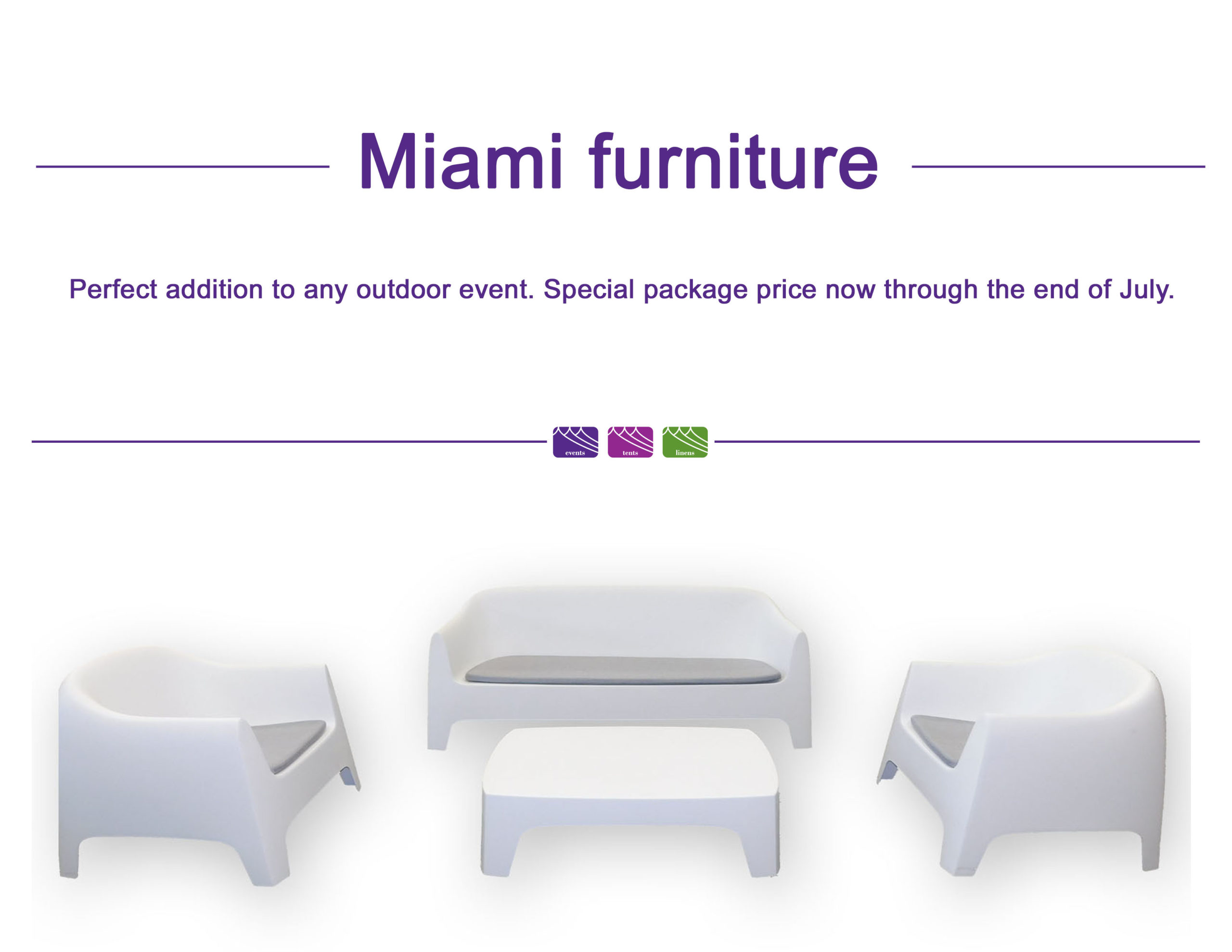 While we have rented lounge furniture for years, we added two new lines of outdoor furniture to rent for our inventory this year. The first is our Miami series, made from hard white plastic that comes with an optional steel colored cushion. The series includes sofas, chairs, coffee tables, and even an outdoor bar that lights up with LEDs. We have created special package pricing as listed below. Our other new series is our INOUT grouping of outdoor vinyl covered ottomans. They include ottomans in 36” pentagons, 36” rounds, and 18” rounds. The covers are removable so there are many colors that are possible.