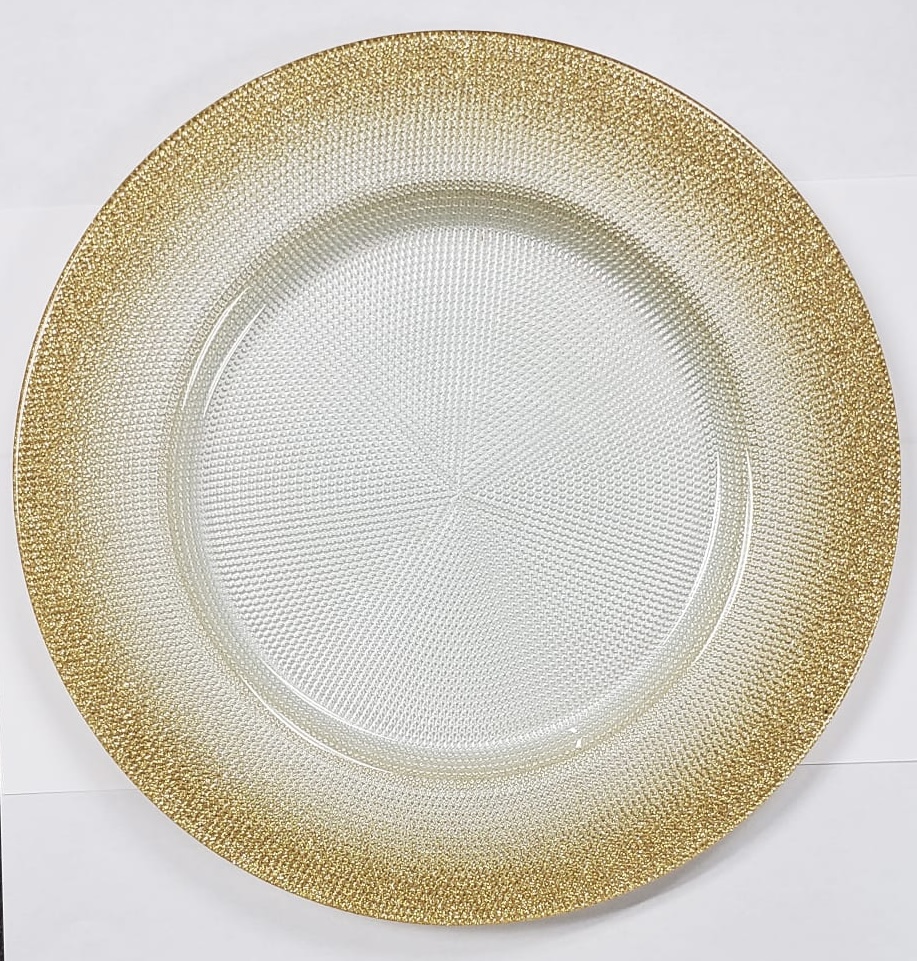Textured glass charger with metallic design to mimic mosaic tiles and unrefined shape to the rim.